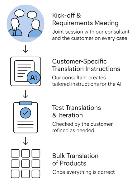 Pilot a sample set. You review; we refine terminology, style, and rules until it reads exactly right. - Bulk Translation of the Catalog
